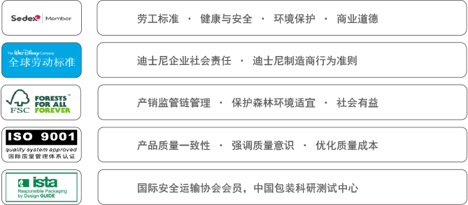 引泓已通過多方認證機構認證,如Sedex認證(供貨商商業道德信息交流),迪士尼全球勞動標準認證,FSC認證,ISO9001質量認證,ista會員等。